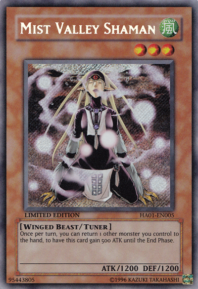 | Card Info | Mist Valley Shaman WIND / Winged Beast-Type Tuner / Level 3 / ATK 1200 / DEF 1200 Once per turn, you can return 1 other monster you control to the hand, to have this card gain 500 ATK until the End Phase. SECRET RARE |