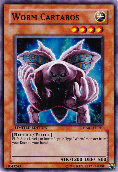 | Card Info | Worm Cartaros LIGHT / Reptile / Level 4 / ATK 1200 / DEF 500 FLIP: Add 1 Level 4 or lower Reptile-Type "Worm" monster from your Deck to your hand. SUPER RARE |