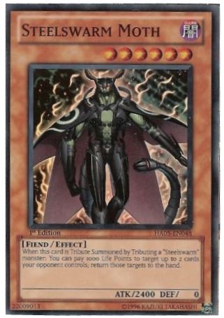 | Card Info | Steelswarm Moth DARK / Fiend / Level 6 / ATK 2400 / DEF 0 When this card is Tribute Summoned by Tributing a "Steelswarm" monster: You can pay 1000 Life Points to target up to 2 cards your opponent controls; return those targets to the hand. SUPER RARE |