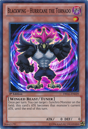 | Card Info | Blackwing - Hurricane the Tornado DARK / Winged Beast-Type Tuner / Level 1 / ATK 0 / DEF 0 Once per turn: You can target 1 Synchro Monster on the field; this card's ATK becomes that monster's current ATK, until the end of this turn. SUPER RARE |