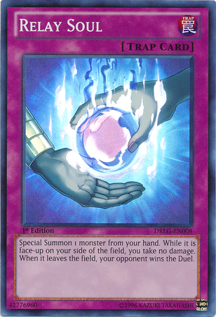 | Card Info | Relay Soul Normal Trap Special Summon 1 monster from your hand. While it is face-up on your side of the field, you take no damage. When it leaves the field, your opponent wins the Duel. SUPER RARE |