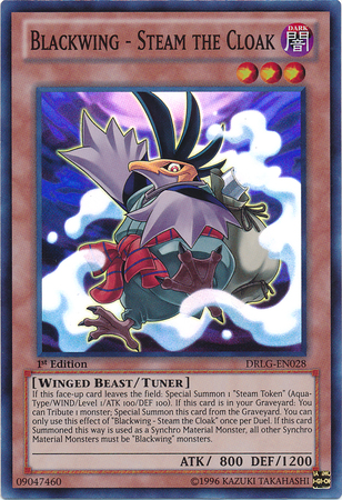 | Card Info | Blackwing - Steam the Cloak DARK / Winged Beast-Type Tuner / Level 3 / ATK 800 / DEF 1200 If this face-up card leaves the field: Special Summon 1 "Steam Token" (Aqua-Type/WIND/Level 1/ATK 100/DEF 100). If this card is in your Graveyard: You can Tribute 1 monster; Special Summon this card from the Graveyard. You can only use this effect of "Blackwing - Steam the Cloak" once per Duel. If this card Summoned this way is used as a Synchro Material Monster, all other Synchro Material Monsters must be "Blackwing" monsters. SUPER RARE |