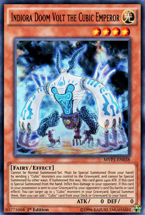 | Card Info | Indiora Doom Volt the Cubic Emperor LIGHT / Fairy / Level 4 / ATK 0 / DEF 0 Cannot be Normal Summoned/Set. Must be Special Summoned (from your hand) by sending 3 "Cubic" monsters you control to the Graveyard, and cannot be Special Summoned by other ways. If Summoned this way, this card gains 2400 ATK. If this card is Special Summoned from the hand: Inflict 800 damage to your opponent. If this card in your possession is sent to your Graveyard by your opponent's card (by battle or card effect): You can target up to 3 "Cubic" monsters in your Graveyard; Special Summon them, then you can add 1 "Cubic" card from your Deck or Graveyard to your hand. ULTRA RARE |