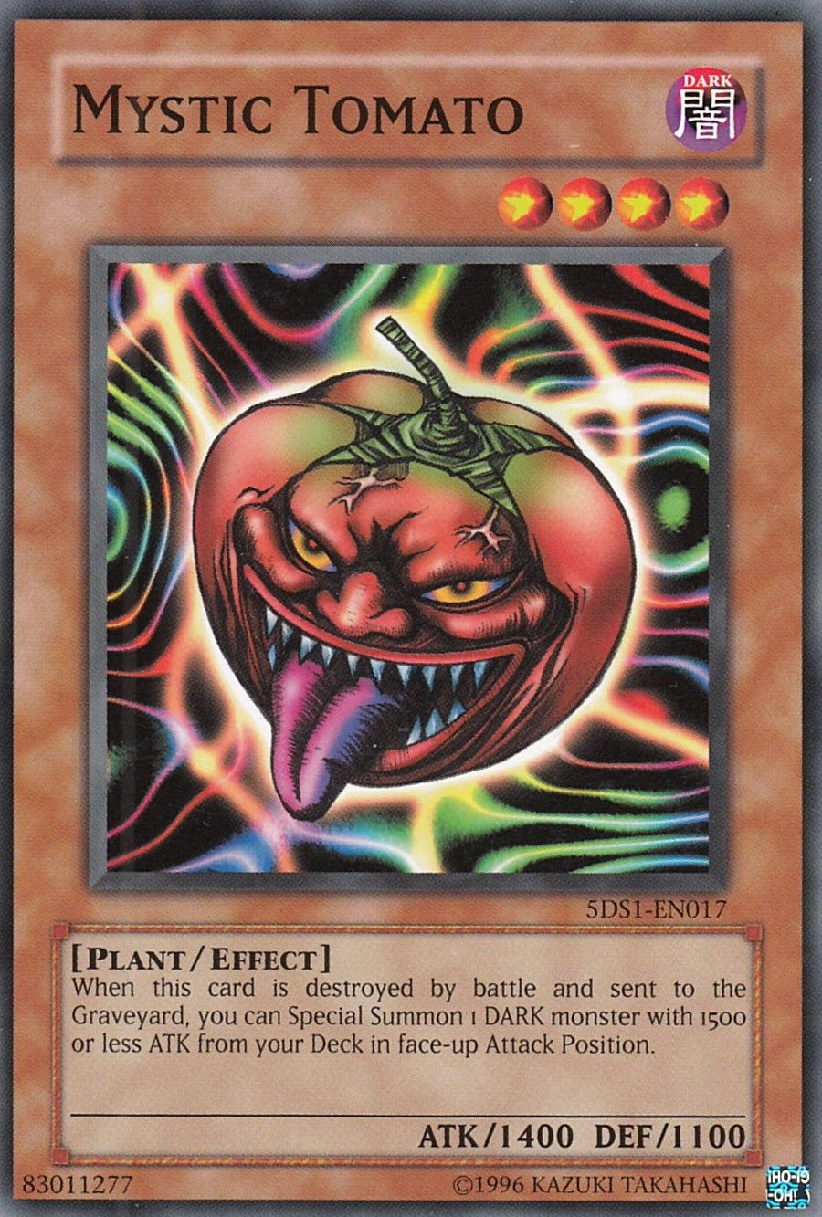 1. Malice Doll of Demise's card was a Level 5 monster in the Dub. 2. In the Dub, Yami says Mystic Tomato is a weak defense and intends on attacking directly but has either forgotten about Mystic Tomato's effect or believes Arkana has nothing to bring out with its effect. 3. Mystic Tomato's hologram image wasn't edited to match the card's artwork in the Dub. |