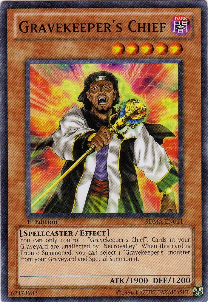 At the duel, Alexis knows Jaden can win the duel and Chumley says he knows he wants out of the sarcophagus. Jaden plays Winged Kuriboh (0200) in Defense Mode and ends his turn. Chief attacks WK but Jaden activates Transcendent Wings, which by sending 2 cards in his hand and WK he controls, he can play Winged Kuriboh LV10. Transcendent Wings, when shown around 3:42 into the episode, is slightly modified for US. He tosses out Silent Doom and Bubbleman, which have also been altered for US as shown at around 3:44 into the episode. However, Chief discards Gravekeeper's Watcher, negating the effect of Transcendent Wings. Next, he attacks and destroys WK with Assailant then sets a card to end his turn. Jaden plays Pot of Greed, adding the top 2 cards of his deck to his hand. Dark Catapulter (left card) has been slightly changed for US as shown at 5:26 into the episode. He plays Dark Catapulter (1500) in Defense Mode. The direction of Dark Catapulter's card has been reversed for US as shown at 5:28 into the episode. Next, he plays Mirage of Nightmare and sets 3 cards to end his turn. Chief draws and Jaden activates Mirage's effect, giving him cards until his hand holds 4.Cheif tributes GC for himself, Gravekeeper's Chief (1900) in Attack Mode and with Necrovalley out, his ATK rises to 2400. Next, while he's out, Chief's Graveyard isn't affected by Necrovalley and he can play a Gravekeeper's monster from his Graveyard, so he plays Gravekeeper's Spear Soldier (1500) in Attack Mode. Then, he activates Rite of Spirit, letting him bring back yet another Gravekeeper's monster and he chooses Curse in Attack Mode. Since Curse was summoned, Jaden takes 500 damage, leaving him with 500. He attacks with Assailant on Dark Catapulter, changing it to Attack Mode but Jaden activates Emergency Provisions, which by sending 2 Spell/Trap Cards to his Grave, he gains 2000 LPs raising his score to 2500 but the attack still goes through, destroying DC and dropping his score to 1500. Chief then attacks with himself but Jaden activates Draining Shield, giving him LPs equal to the attacking monster's ATK, boosting his score to 3900. However, Chief still has more monsters and attacks with them, dropping Jaden's score to 600. Jaden laughs, saying he's having a blast but Chief tells him he won't as he plays Royal Tribute, which discards all monsters in both players' hands to the Graveyard if Necrovalley is out. Oops! At 10:48 into the episode, Clayman and Sparkman are effect monsters in the US! Jaden draws and smiles but its a shame that he has nothing to tribute for it...or does he even need any? He has Elemental Hero Necroshade in the Graveyard, which can't be negated by Necrovalley so he plays Elemental Hero Bladedge (2600) in Attack Mode and attacks GC, destroying it. Oops! As Chief shields his eyes from the attack at 13:46 into the episode, his duel disk in the dubbed version shows Dark Magician of Chaos on his duel disk! Chief's score drops to 0.The others as well as Jaden rush over. The remaining Gravekeeper's hold back Jaden but Chief says he was a formidable opponent and hands Jaden a medallion. Some gift, it's only half of a medallion. Chief explains that the other person to beat his challenge holds the other half. He hopes the medallion will pull him through someday. So how do they get home? Chief explains that they have to get to the tome before the three suns combine into one but as they start to leave an army of GG and SS block their way.