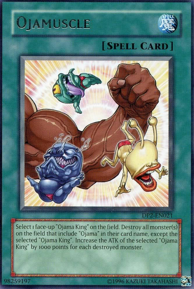Then he uses Poly to bring out Ojama King (0000) in Attack Mode. Next he activates Ojamuscle, destroying all Ojama cards out and giving OK 1000 ATK for each one. Since the destroyed Ojama cards were the tokens, Don loses 900 points leaving him with 300. OK's ATK rises to 3000 and he finishes off Don's LPs. The scorpions disappear and Chazz picks up the Millennium Eye-like thing and the card, saying that's one less Shadow Rider they have to worry about. Chumley says good riddens and Banner agrees, saying that the Spirit Keys are back in safe hands. Alexis wonders what happened to the DS monster. Jaden doesn't know but Chazz seems concerned. Later that night, Chazz puts the earplugs back into his ears and starts sleeping but all the DS and Ojama Yellow are having a party. |