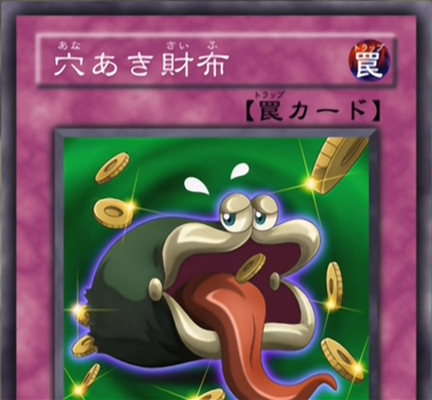 X discards his newly drawn cards. X didn't want Jaden to get off so easily and activates Purse with a Hole, which randomly discards cards from Jaden's hand until Jaden has only 5 cards and prevents Jaden from using the cards in his hand. Next he activates Soul Connection, letting him add a monster from his Deck to his hand (though X makes it seem like he retrieves it from his Grave) and he selects TS. Jaden ends his turn. X uses Pot of Greed. Next he summons his Trap Sluzer in Attack Mode, causing Jaden to lose 4 cards by MR's effect. (Apparently the card affects both players.) Jaden draws and X activates Gachi Battle, forcing both of them to summon a monster from their deck each turn. Jaden plays Neo-Spacian Glow Moss (0300) in Attack Mode and with MR's effect, he loses another 3 cards. Then Jaden uses GM's effect, letting X flip over the top card and trigger 1 of GM's effects or pass and if he does, Jaden loses another 2 cards from the top of his deck. (The real card doesn't let the opponent choose whether or not to flip the card.) Next Jaden uses Neos Energy, giving GM 800 ATK to 1100.