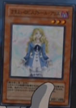 At DA, Dorothy panics about having only 2 hours to clean the place but is thankful for the CatVac2000(which looks very much like Pharaoh, I might add) She talks about reality shows and how one can forget to clean the place. She then notices the lack of doll in the case. Jaden and the gang arrive, saying it's good to be back. Winged Kuriboh tells Jaden a stranger is inside. The gang rush over to find that someone cleaned it up (besides Dorothy) A little girl (which Syrus and Hassleberry seem to be already falling for) welcomes them home, then introduces herself as Alice. Inside, she serves them all tea. Jaden asks what Alice is doing here and she tells them she's a transfer student that moved in (although she's clearly lying by the way she says it) Syrus tries to point out about DA needing new students to pass the exam but is interrupted by Hassleberry and ends up dumping his tea back into the cup. Hassleberry says Alice is here and his lonely days are over. (What do you call the people you actually hang out with then, Hassleberry?) Later that night, Bastion shows as Jaden apparently forgets he called Bastion over. Bastion isn't impressed until he hears that Alice cooks and made the rather large amount of food on the table. Jaden doesn't seem to know why but guesses Alice is just being nice. Syrus adds that she seems to be nicer to some than others. Hassleberry continues his "love speech" with Alice as Bastion wishes he met her first, then feels like he's met her before.
