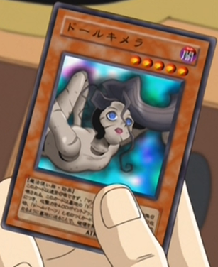 She then activates Necro Dollmeister, letting her summon 2 Doll Part monsters from her deck and she chooses Doll Part Red and Doll Part Pink (0000 x2) in Defense Mode. Then she activates Soul Resurrection, letting her bring back Doll Part Gold in Defense Mode. She then attacks AWD with Doll Part Blue, leaving her with 1800, then due to AWD, she loses 500 more LPs, leaving her with 1300 but AWD returns to her field. Finally, she uses Marionette Burial, letting her tribute her Doll Part monsters to play Doll Chimera (0000) in Attack Mode. Jaden knows he'll be having nightmares tonight. For every Doll Part monster in Alice's Grave, it gains 400 ATK for a total of 1600. She ends her turn (which was dumb since she could've attacked and dealt Jaden some damage.) Jaden draws and plays Rallis the Star Bird (0800) in Attack Mode. He attacks and destroys DC with it, leaving Alice with 1100. Then, due to Rallis' effect, it's removed from play. Bastion thinks that Alice wanted Jaden to attack as DC reappears. Alice explains that her monster cannot be destroyed and by sending 2 Doll Part monsters from her deck to her Graveyard, she can bring her Doll Chimera back.