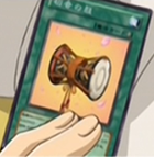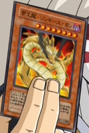 Jaden summons Elemental Hero Wildheart (1600) in Defense Mode, apparently by MH's effect but MH's effect forces the monster to be in Attack Mode. He attacks with Ben Kei again (due to his effect, though as usual, left out), destroying only Wildheart as MH prevents his monster from being destroyed by destroying the Equip Spell itself and deals 500 damage to Jaden, leaving him with 3100. He attacks directly with YT, leaving Jaden with 1800. Then he exchanges his Field Spell for another one called Cherry Blossom Mountain (actually apparently named Kabuki Stage - Cherry Blossom Mountain but was probably shortened for less editing) and Jaden hopes for better luck in this scene. Next, he plays Shizuka the Heavenly Dancer (0300) in Attack Mode and equips her with New Year Drum, which neither Hassleberry, nor Syrus (nor I) know what the card does.