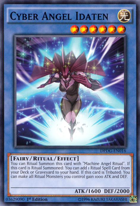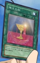 MD attacks, destroying Mermaid Knight and leaving the two girls with 1200 LPs. Next he plays Divine Chalice, summoning a token to MD's field, which he uses to destroy Rescue Cat. The girls decide to surrender as Alexis shows, telling them they're pathetic and a disgrace to Obelisk Blue students and girls everywhere.She decides to duel in their place with their own LPs. MD accepts Alexis' condition and sets 1 monster to end his turn. Alexis draws, activating Machine Angel Ritual to bring out Cyber Angel Benten (1800) in Attack Mode. MD isn't impressed, saying he's seen tougher soufflés but Alexis isn't done and plays Ritual Weapon, giving Benten 1500 ATK for a total of 3300. Oops still again! Benten's ATK is shown in a LP meter instead of it's correct graphic in the US at 13:45 into the episode.