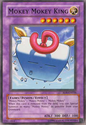 EPW tells Belowski to just go and he does, playing Dark Factory of Mass Production, returning his 2 Mokey Mokeys back to his hand. Then he uses Poly for Mokey Mokey King (0300) in Attack Mode and as usual, everyone else falls asleep so EPW hands the metals to Belowski, saying he's going to sleep. Jaden and crew wake up from their "sleep" and hear a scream. They find Jasmine and Mindy, Alexis' friends dueling Maître D, another pro duelist. MD explains that his Bacchus gets 300 ATK for something not explained. Oops yet again! Baccus' ATK is shown in a LP meter instead of the ATK/DEF graphic in the US at 11:11 into the episode!