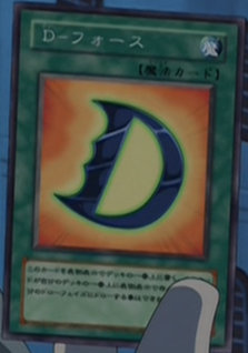 Then he plays Mining for Magical Stones (Magical Stone Excavation in the TCG), letting him get back his GC by discarding 2 cards, one of which is RFG the other (Monster Reincarnation) is sent to the Grave. Once again, he uses Graceful Charity. Finally, he uses Dimension Fusion to bring back his Cosmo Queen (2900) 3 Magician's Valkyrias (1600 x3) and Ebon Magician Curran (1200) all in Attack Mode for 2000 LPs, leaving him with 2000. The group watching the duel fear that The D is in big trouble as with EMC's effect, The D takes 300 damage each time he summons a monster (The real card only deals damage during your own Standby Phase, which DC has already passed). DC attacks with his monsters but The D activates Negate Attack, ending the Battle Phase and Cosmo Queen's attack. However, DC isn't done as he plays Magical Blast, dealing 200 damage to The D for every Spellcaster DC has out, leaving The D with 3000. He sets 1 card face down thinking that he's won this duel. The D introduces his "friend" as The Dark Light and DC can't make any sense of this but in any case, The D draws and plays 2 Fiend's Sanctuary cards giving him 2 Metal Fiend Tokens (0000 x2) in Attack Mode. Then he plays D - Force, which he puts face up on top of his deck. Next he tributes his 3 monsters for his ultimate card but before we find out what it is, the cable cuts out. Aster sees this and calls The D, who requests Aster to come over. When he does, we see the immense size comparison between The D's and Aster's boats. Aster opens the doors to find The D, who explains how he won the duel. The doors behind Aster close as The D says the only other exit is behind himself. He also explains that he's the one who took Aster's father. |