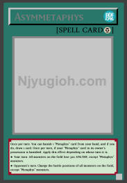|  | Asymmetaphys Continuous Spell Once per turn: You can banish 1 "Metaphys" card from your hand, and if you do, draw 1 card. Once per turn, if your "Metaphys" card in its owner's possession is banished: Apply this effect depending on whose turn it is. ● Your turn: All monsters on the field lose 500 ATK/DEF, except "Metaphys" monsters. ● Opponent's turn: Change the battle positions of all monsters on the field, except "Metaphys" monsters. RARE |