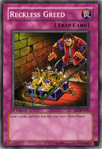 | Card Info | Reckless Greed Normal Trap Draw 2 cards, and after that skip your next 2 Draw Phases. COMMON |