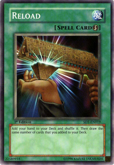 | Card Info | Reload Quick-Play Spell Add your hand to your Deck and shuffle it. Then draw the same number of cards that you added to your Deck. COMMON |