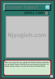 Ancient Forest Field Spell When you activate this card, change any Defense Position monster(s) to face-up Attack Position. Flip Effects are not activated at this time. If a monster attacks, destroy it at the end of that turn's Battle Phase. RARE |