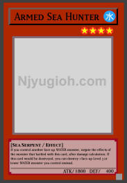 Armed Sea Hunter WATER / Sea Serpent / Level 4 / ATK 1800 / DEF 400 If you control another face-up WATER monster, negate the effects of the monster that battled with this card, after damage calculation. If this card would be destroyed, you can destroy 1 face-up Level 3 or lower WATER monster you control instead. SUPER RARE |