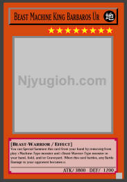 Beast Machine King Barbaros Ür EARTH / Beast-Warrior / Level 8 / ATK 3800 / DEF 1200 You can Special Summon this card from your hand by removing from play 1 Machine-Type monster and 1 Beast-Warrior-Type monster in your hand, field, and/or Graveyard. When this card battles, any Battle Damage to your opponent becomes 0. COMMON |