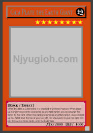 Gaia Plate the Earth Giant EARTH / Rock / Level 8 / ATK 2800 / DEF 1000 You can Special Summon this card by removing from play any 2 Rock-Type monsters in your Graveyard. During your Standby Phase, remove from play 1 Rock-Type monster in your Graveyard, or send this card to the Graveyard. Halve the ATK and DEF of any monster that battles with this card. RARE |