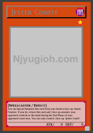 Jester Confit DARK / Spellcaster / Level 1 / ATK 0 / DEF 0 You can Special Summon this card from your hand in face-up Attack Position. If you do, return this card and 1 face-up monster your opponent controls to the hand during the End Phase of your opponent's next turn. You can only control 1 face-up "Jester Confit". RARE |