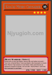 Koa'ki Meiru Crusader EARTH / Beast-Warrior / Level 4 / ATK 1900 / DEF 1300 During each of your End Phases, destroy this card unless you send 1 "Iron Core of Koa'ki Meiru" from your hand to the Graveyard or reveal 1 Beast-Warrior-Type monster in your hand. If this card destroys an opponent's monster by battle, you can add 1 "Koa'ki Meiru" card from your Graveyard to your hand. RARE |