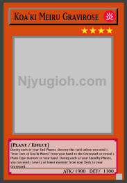 Koa'ki Meiru Gravirose FIRE / Plant / Level 4 / ATK 1900 / DEF 1300 During each of your End Phases, destroy this card unless you send 1 "Iron Core of Koa'ki Meiru" from your hand to the Graveyard or reveal 1 Plant-Type monster in your hand. During each of your Standby Phases, you can send 1 Level 3 or lower monster from your Deck to your Graveyard. COMMON |