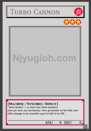 Turbo Cannon FIRE / Machine-Type Synchro / Level 3 / ATK 0 / DEF 0 "Turbo Rocket" + 1 or more non-Tuner monsters Once per turn, you can destroy 1 face-up monster on the field, and inflict damage to its controller equal to half of its ATK. RARE |