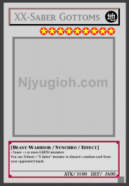 XX-Saber Gottoms EARTH / Beast-Warrior-Type Synchro / Level 9 / ATK 3100 / DEF 2600 1 Tuner + 1 or more EARTH monsters You can Tribute 1 "X-Saber" monster to discard 1 random card from your opponent's hand. RARE |