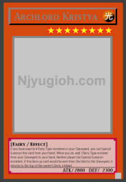 Archlord Kristya LIGHT / Fairy / Level 8 / ATK 2800 / DEF 2300 If you have exactly 4 Fairy-Type monsters in your Graveyard, you can Special Summon this card from your hand. When you do, add 1 Fairy-Type monster from your Graveyard to your hand. Neither player can Special Summon monsters. If this face-up card would be sent from the field to the Graveyard, it returns to the top of the owner's Deck, instead. RARE |