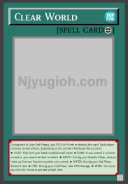 Clear World Field Spell During each of your End Phases, pay 500 Life Points or destroy this card. Each player receives certain effects, depending on the monster Attributes they control: ● LIGHT: Play with your hand revealed at all times. ● DARK: If you control 2 or more monsters, you cannot declare an attack. ● EARTH: During your Standby Phase, destroy 1 face-up Defense Position monster you control. ● WATER: During your End Phase, discard 1 card. ● FIRE: During your End Phase, take 1000 damage. ● WIND: You must pay 500 Life Points to activate a Spell Card. COMMON |