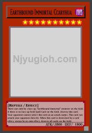 Earthbound Immortal Ccaryhua DARK / Reptile / Level 10 / ATK 2800 / DEF 1800 There can only be 1 face-up "Earthbound Immortal" monster on the field. If there is no face-up Field Spell Card on the field, destroy this card. Your opponent cannot select this card as an attack target. This card can attack your opponent directly. When this card is destroyed by a card effect, except by its own effect, destroy all cards on the field. SUPER RARE |