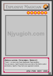 Explosive Magician LIGHT / Spellcaster-Type Synchro / Level 6 / ATK 2500 / DEF 1800 1 Tuner + 1 or more non-Tuner Spellcaster-Type monsters You can remove 2 Spell Counters from your side of the field to select and destroy 1 Spell or Trap Card your opponent controls. RARE |