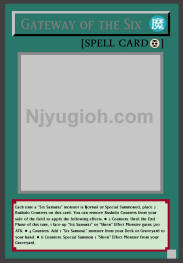 Gateway of the Six Continuous Spell Each time a "Six Samurai" monster is Normal or Special Summoned, place 2 Bushido Counters on this card. You can remove Bushido Counters from your side of the field to apply the following effects. ● 2 Counters: Until the End Phase of this turn, 1 face-up "Six Samurai" or "Shien" Effect Monster gains 500 ATK. ● 4 Counters: Add 1 "Six Samurai" monster from your Deck or Graveyard to your hand. ● 6 Counters: Special Summon 1 "Shien" Effect Monster from your Graveyard. RARE |