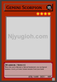 Gemini Scorpion EARTH / Warrior / Level 4 / ATK 1600 / DEF 400 When this card is Normal or Special Summoned, you can Special Summon 1 Level 4 or lower Gemini monster from your hand. SUPER RARE |