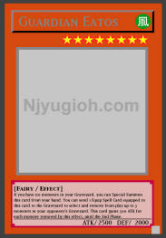 Guardian Eatos WIND / Fairy / Level 8 / ATK 2500 / DEF 2000 If you have no monsters in your Graveyard, you can Special Summon this card from your hand. You can send 1 Equip Spell Card equipped to this card to the Graveyard to select and remove from play up to 3 monsters in your opponent's Graveyard. This card gains 500 ATK for each monster removed by this effect, until the End Phase. RARE |