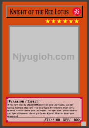 Knight of the Red Lotus FIRE / Warrior / Level 6 / ATK 2100 / DEF 1800 If you have exactly 3 Normal Monsters in your Graveyard, you can Special Summon this card from your hand by removing from play 2 Normal Monsters from your Graveyard. Once per turn, you can select and Special Summon 1 Level 4 or lower Normal Monster from your Graveyard. COMMON |