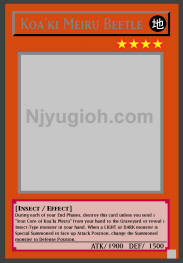 Koa'ki Meiru Beetle EARTH / Insect / Level 4 / ATK 1900 / DEF 1500 During each of your End Phases, destroy this card unless you send 1 "Iron Core of Koa'ki Meiru" from your hand to the Graveyard or reveal 1 Insect-Type monster in your hand. When a LIGHT or DARK monster is Special Summoned in face-up Attack Position, change the Summoned monster to Defense Position. RARE |