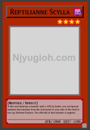 Reptilianne Scylla DARK / Reptile / Level 4 / ATK 1800 / DEF 1200 If this card destroys a monster with 0 ATK by battle, you can Special Summon that monster from the Graveyard to your side of the field in face-up Defense Position. The effect(s) of that monster is negated. SUPER RARE |