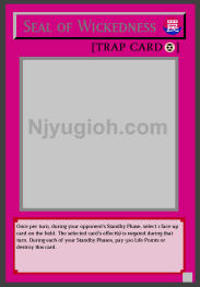 Seal of Wickedness Continuous Trap Once per turn, during your opponent's Standby Phase, select 1 face-up card on the field. The selected card's effect(s) is negated during that turn. During each of your Standby Phases, pay 500 Life Points or destroy this card. RARE |