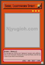 Shire, Lightsworn Spirit LIGHT / Fairy / Level 3 / ATK 400 / DEF 1400 This card gains 300 ATK for each "Lightsworn" monster with a different name in your Graveyard. During each of your End Phases, send the top 2 cards of your Deck to the Graveyard. COMMON |
