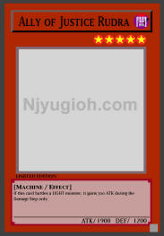 Ally of Justice Rudra DARK / Machine / Level 5 / ATK 1900 / DEF 1200 If this card battles a LIGHT monster, it gains 700 ATK during the Damage Step only. SUPER RARE |