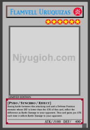Flamvell Uruquizas FIRE / Pyro-Type Synchro / Level 6 / ATK 2100 / DEF 400 During battle between this attacking card and a Defense Position monster whose DEF is lower than the ATK of this card, inflict the difference as Battle Damage to your opponent. This card gains 300 ATK each time it inflicts Battle Damage to your opponent. SECRET RARE |