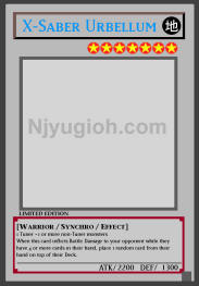 X-Saber Urbellum EARTH / Warrior-Type Synchro / Level 7 / ATK 2200 / DEF 1300 1 Tuner + 1 or more non-Tuner monsters When this card inflicts Battle Damage to your opponent while they have 4 or more cards in their hand, place 1 random card from their hand on top of their Deck. SECRET RARE |