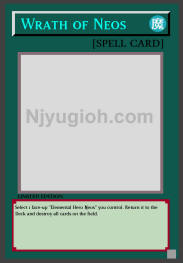 Wrath of Neos Normal Spell Select 1 face-up "Elemental Hero Neos" you control. Return it to the Deck and destroy all cards on the field. SECRET RARE |