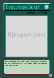 Evolution Burst Normal Spell Activate only while you control a face-up "Cyber Dragon"(s). Destroy 1 card your opponent controls. "Cyber Dragon" cannot attack the turn you activate this card. SECRET RARE |