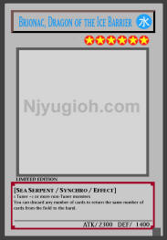 Brionac, Dragon of the Ice Barrier WATER / Sea Serpent / Level 6 / ATK 2300 / DEF 1400 1 Tuner + 1 or more non-Tuner monsters You can discard any number of cards to return the same number of cards from the field to the hand. SECRET RARE |