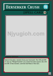 Berserker Crush Quick-Play Spell Remove from play 1 monster from your Graveyard. The ATK and DEF of 1 face-up "Winged Kuriboh" you control becomes equal to the ATK and DEF of that monster, until the End Phase of this turn. SUPER RARE |
