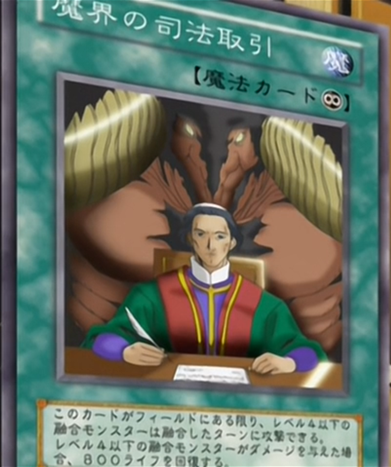 Noah is having second-thoughts about The Big Five and is ready to do everything else himself. Johnson interrupts, pleading to Duel someone to make up for Gansley's failure. Noah agrees but it's not soon enough for Joey, whom kicks down a a wall that revreals a door in front of the airship. While Kaiba and Mokuba try in vain to contact the airship, Joey encounters Johnson, whom brings their Duel to a courtroom and transforms into Judge Man. Joey starts to get the upper hand thanks to his Deck Master's ability but Johnson's Deck Master ability takes away all his hard work and puts Joey in a tight spot. |
