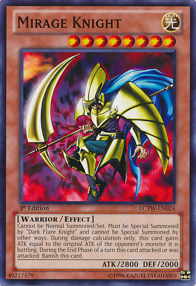 to serve as their Deck Master. 2. If their Deck Master was destroyed, the owner(s) lost the Duel automatically. 3. Players could move their Deck Masters to the field at any time during their turn. 4. Flame Swordsman and Dark Magician were Deck Masters. 5. Five-Headed Dragon was a Ritual Monster that was Ritual Summoned using "Dragon Revival Ritual" and 5 monsters each with a different Attribute. It also couldn't attack the turn it was Summoned and destroyed all the opponent's monsters when Ritual Summoned. 6. Mirage Knight Special Summoned Dark Flare Knight and Dark Magician when it left the field by its effect. 7. A Deal with Dark Ruler was a Trap Card with different artwork that also cost half the owner's LP to use and reduced the damage to 0. 8. Magical Hats was a Spell Card with different artwork that could hide monsters under the hats and/or double the number of hats it brought out for 1000 LP. |